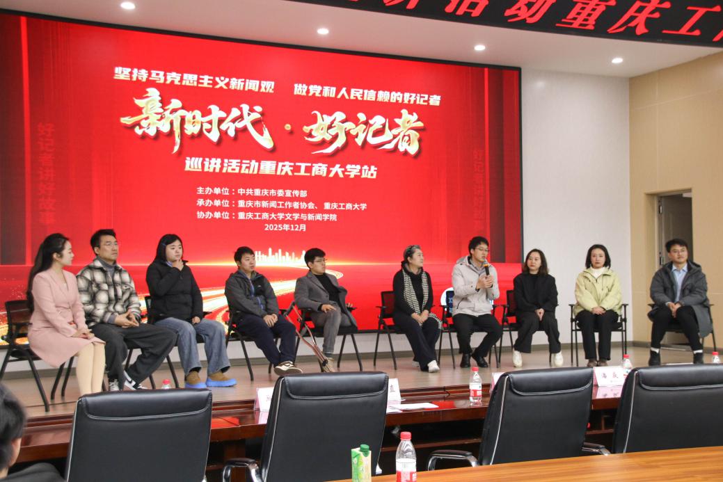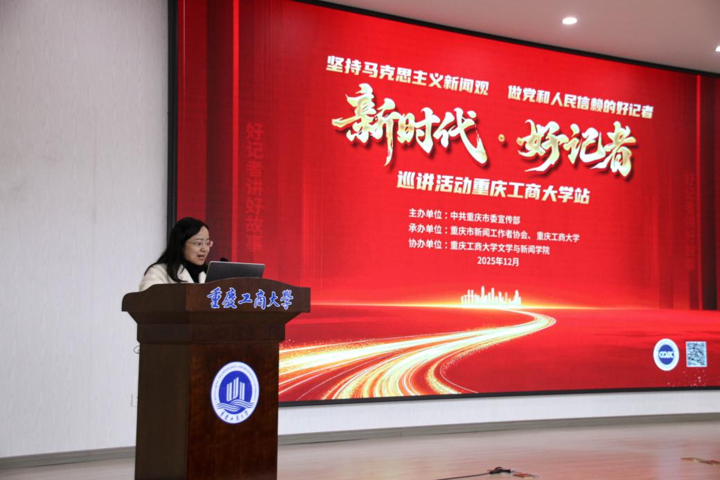 为深入贯彻马克思主义新闻观、深刻理解新闻工作者的使命与担当,12月30日上午,由中共重庆市委宣传部主办,重庆市新闻工作者协会、重庆工商大学承办,文学与新闻学院协办的“新时代·好记者”巡讲活动在南岸校区明德楼1019报告厅顺利开展。文学与新闻学院党委书记、副院长潘焱,党委副书记、院长殷俊,副院长郑笑眉以及全院70余名师生齐聚一堂,畅谈新闻理想、共话时代内涵。