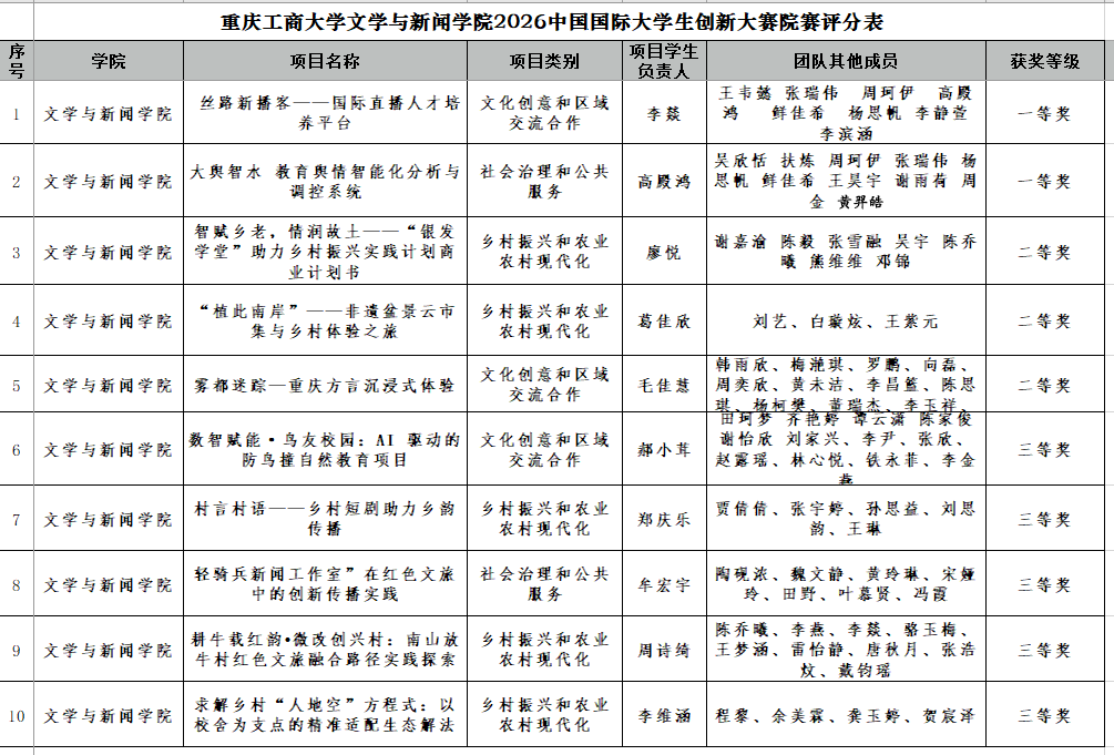 为深入贯彻落实国家“十五五”规划战略部署,积极响应学校巡察整改工作要求,全面深化创新创业教育改革,激发青年学生的创新精神和创造活力,近日,文学与新闻学院2026年中国国际大学生创新大赛院内选拔赛圆满落下帷幕。