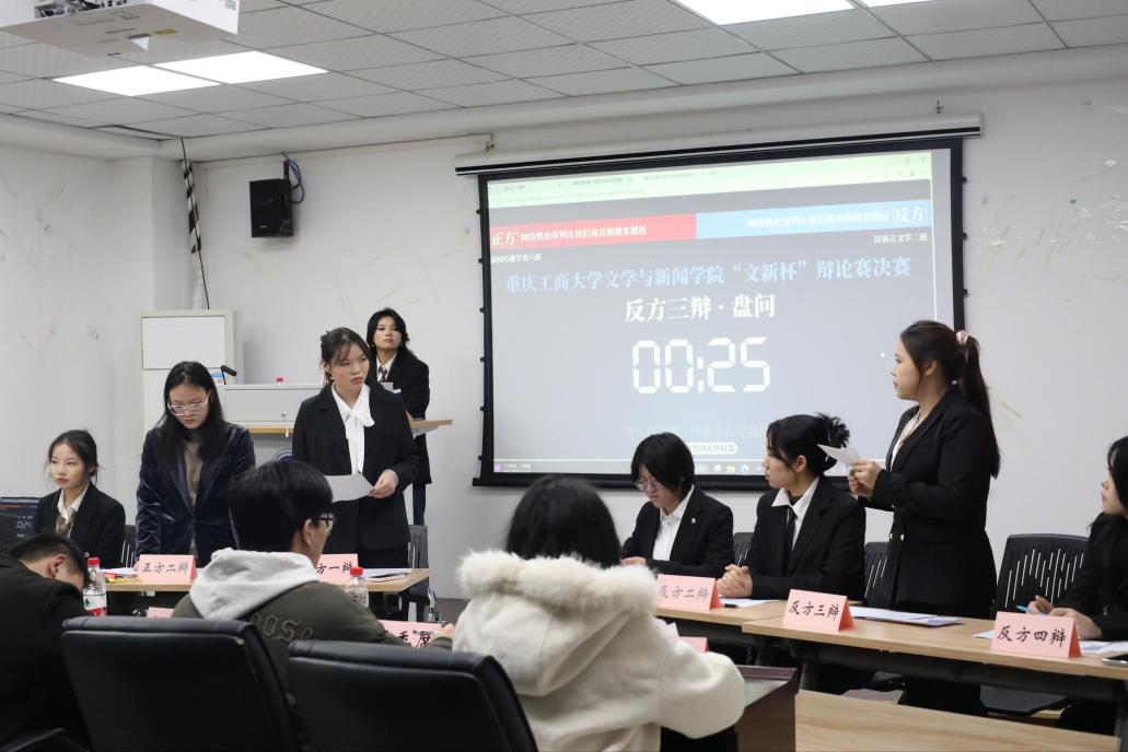 据悉,此次比赛由文学与新闻学院分团委主办、文学与新闻学院辩论队承办、中国移动重庆南岸分公司协办。经过初赛、复赛的激烈交锋,2025级汉语言文学二班、2025级新闻传播学类六班的参赛团队成功晋级决赛。决赛现场,两支队伍围绕“网络舆论审判让我们离正义越来越近还是越来越远”展开了一场思维与口才的巅峰对决。辩论过程中,正方从网络舆论审判的含义与本质切入,结合具体数据与典型案例论证网络舆论与事实真相的“远近关系”;反方则从“舆论压力”的角度出发、层层推进,指出网络舆论审判缺乏程序正义。在质询盘问与自由辩论的环节中,双方辩手旁征博引、你来我往、金句频出,现场气氛热烈、掌声不断。