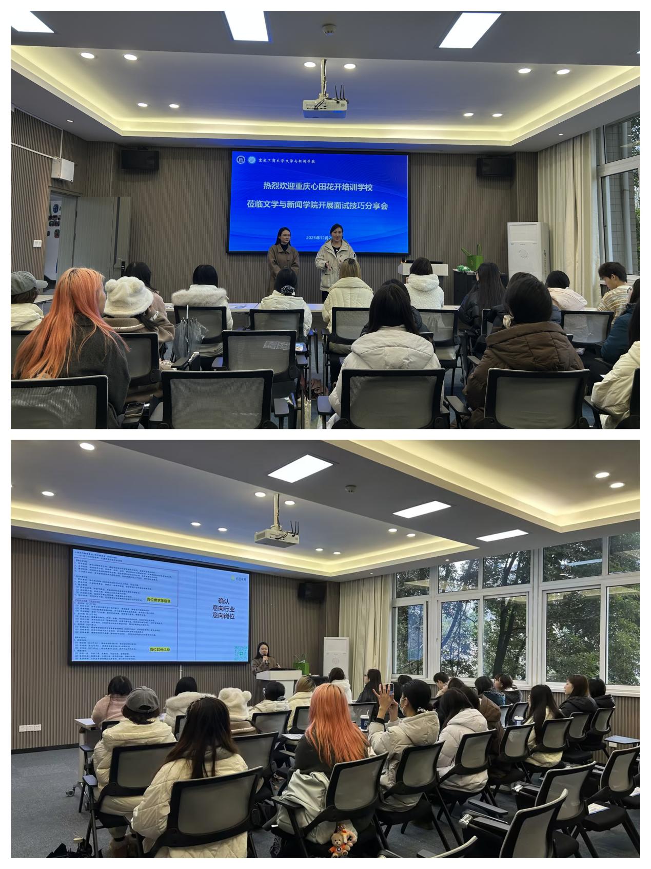 为帮助学生明晰职业发展路径、提升求职核心竞争力,扎实推进毕业生就业工作,12月25日,文学与新闻学院特邀重庆心田花开培训学校人力资源部负责人王静,为2022级、2023级、2024级本科生开展就业技巧专题培训会。本次活动吸引30余名同学参与,现场交流氛围热烈。