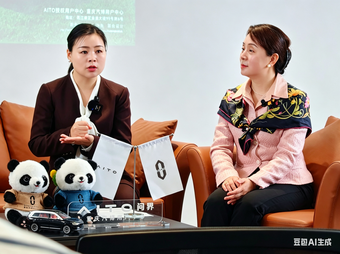 图片:AIOT问界汽博用户中心总经理郝伟(左)向朱洁教授(右)及同学们做讲解