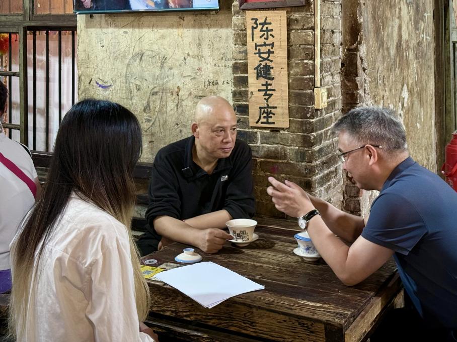 陈安健教授多年来通过画笔记录茶馆内的人间百态,并出资维持茶馆的运营,使其在城市更新的浪潮中得以保留。在采访过程中,朱东教授现场教学,从人物采访的切入点选择、引导提问的逻辑顺序,到画面构图的艺术设计、拍摄转场的叙事技巧,对学生们进行了一次全流程的“实战教学”。