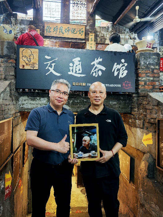在教学活动中,朱东教授亲自为同学们进行拍摄示范,捕捉了陈安健教授在茶馆中的神韵,当场创作并冲洗出一幅精美的摄影作品,赠予陈安健教授。陈教授对这份特别的礼物感到非常兴奋,当场就挂在茶馆醒目的墙柱上。