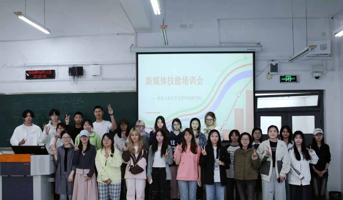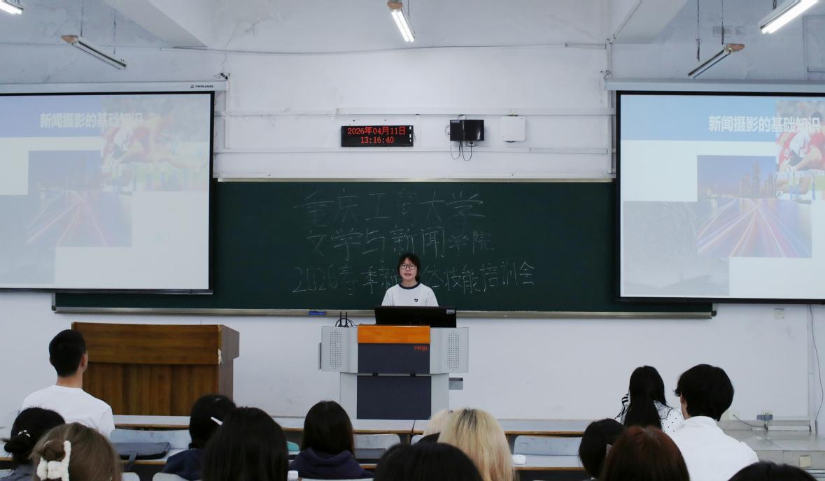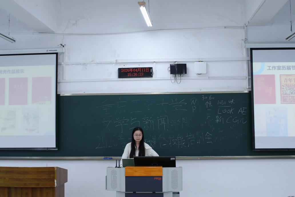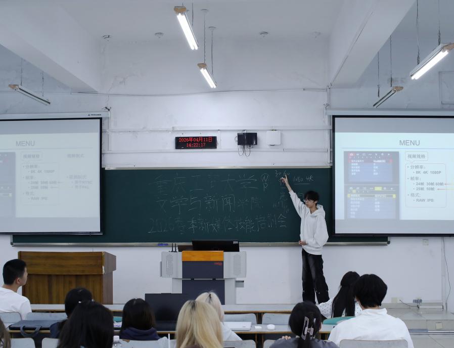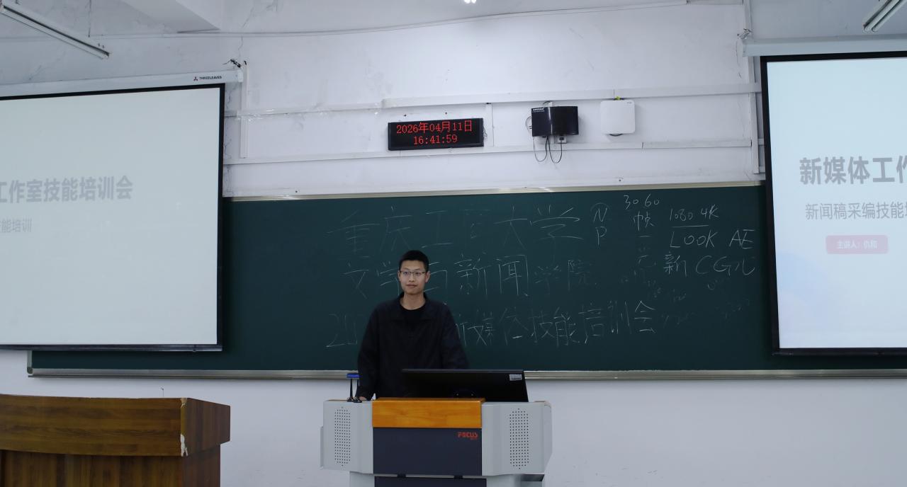 4月11日下午,我院新媒体工作室于南岸校区博智楼07408教室举办2026年春季技能培训会。本次培训会围绕摄影修图、摄像剪辑、海报与推文制作、新闻稿写作四大单元展开教学,特邀冯晓倩、王艺斌、杨粱红、仇和四名经验丰富、实力过硬的学长学姐担任主讲嘉宾。本次活动由2025级新闻传播类的本科生魏鹏丹主持。